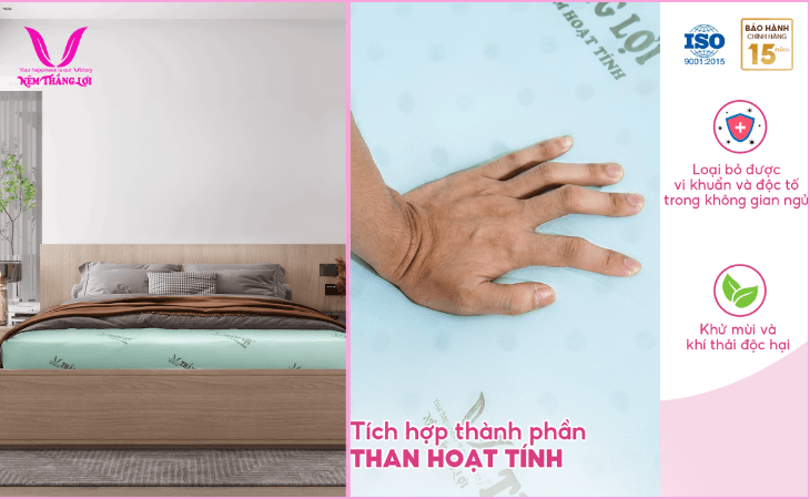 - Khả Năng Khử Mùi Tốt: Nệm có mùi thơm nhẹ tự nhiên, không gây khó chịu nhờ đặc tính khử mùi và hút ẩm của than hoạt tính.